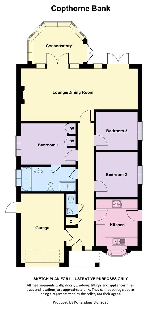 * Covered Porch * Entrance HallDouble-glazed patterned window and door to front. Built-in cupboard, 2x radiators, fully carpeted, doors to garage, bedrooms, kitchen, lounge and:* CloakroomWhite wash-hand basin, low level W.C, radiator, part-tiled walls, ceramic tiled flooring.* Kitchen: 2.99m (excluding bay window) x 2.79m (9' 10 x 9' 2 )With a range of base and wall units, worktops on 3 sides, built-in double oven, built-in microwave, 5-burner gas hob and extractor above, integrated dishwasher, integrated fridge, washing machine, 1.5 bowl sink with double-glazed bay window above, door to side, radiator, part-tiled walls. * Bedroom 1: 3.81m (inc recess) x 2.86m (12' 6 x 9' 5 )Double-glazed window to side, built-in-double wardrobe, radiator, fully carpeted, door to: * Jack & Jill Bathroom: 3.8m x 1.75m (12' 6 x 5' 9 )White suite consisting of wash-hand basin, low level wc, panel enclosed bath. Separate shower cubicle, part-tiled walls, doors to both Bedroom 1 and Hallway. * Bedroom 2: 3.08m x 2.82m (10' 1 x 9' 3 )Double-glazed window to side, radiator, fully carpeted. * Bedroom 3: 2.82m x 2.7m (9' 3 x 8' 10 )Double-glazed window to side, radiator, fully carpeted. * Lounge / Dining Room: 7.8m x 3.26m (25' 7 x 10' 8 )Large room with double-glazed windows and two sets of French doors, one leading to the Conservatory and the other directly into the South-facing garden. Feature gas fireplace with granite surround and hearth, 2x radiators, fully carpeted. * Conservatory: 3.45m x 2.57m (11' 4 x 8' 5 )Attractive Conservatory with air conditioning, with double doors to side to the patio area and: * Integrated Garage: 4.72m x 2.97m (15' 6 x 9' 9 )Up and over door, power and light, door to side.