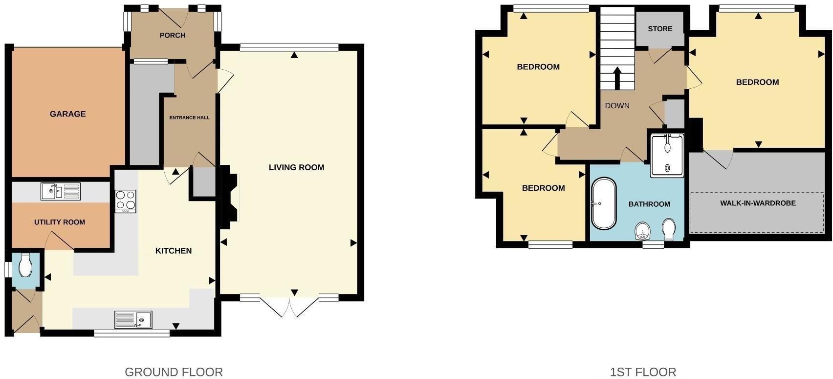 To the first floor the landing enjoys a large walk in storage cupboard and the main bedroom benefits from a generous walk-in wardrobe, providing ample storage space. There are 2 further double bedrooms and a family bathroom with bath and shower cubicle.